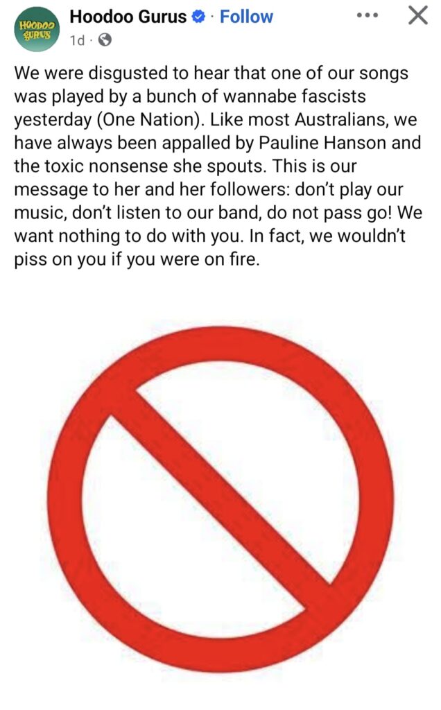 I suspect that most Aussies who liked my music would suddenly dislike me if they started reading the political stuff that I was writing about, which is why I stopped doing that. It’s of no use trying to inject politics into the mix. You’re only going to alienate half your potential audience which is why I’m staying largely neutral from now on. I saw something yesterday that was posted by the Hoodoo Gurus on the social media platform Instagram.